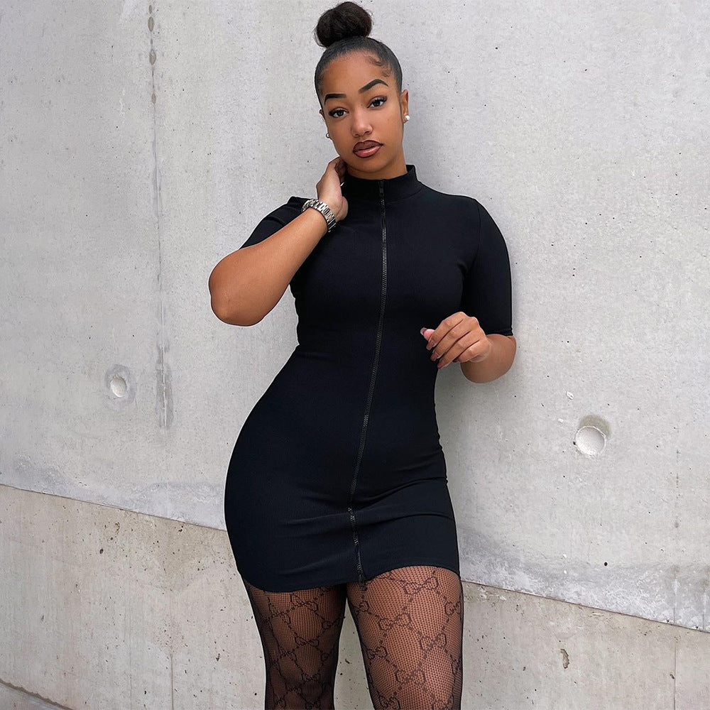 Women's Fashion Tight Zip Milk Silk Solid Color Half Sleeve Dress